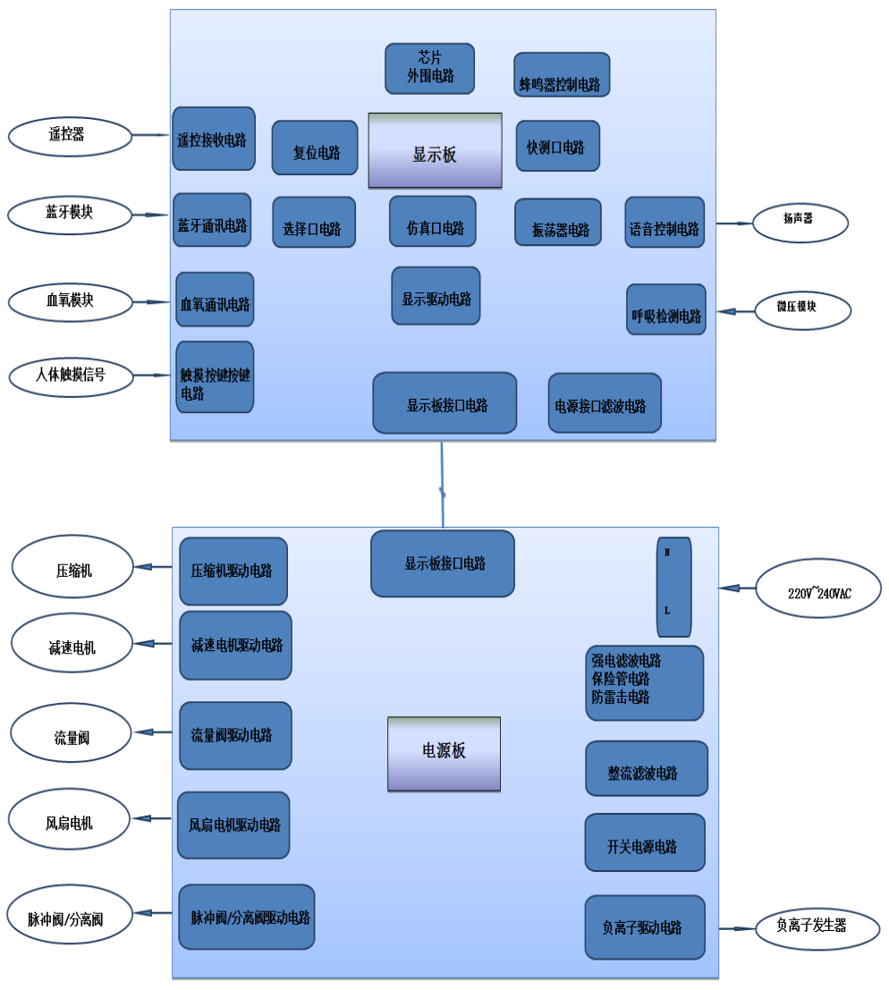 3)可支持遥控接收,蓝牙通讯、血氧模组、电磁阀、风机、加湿等部件的选配需求;