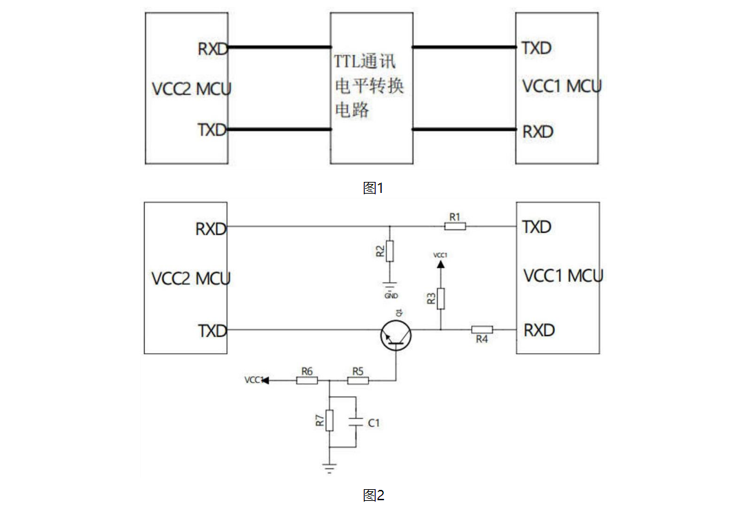 本实用新型公开一种TTL通讯电平转换电路,用于实现第一MCU与第二MCU之间的通信,且第一MCU的工作电源为VCC1,第二MCU的工作电源为VCC2;TTL通讯电平转换电路包括电阻R1、电阻R2、电阻R3、电阻R4、电阻R6、电阻R7、三极管Q1;电阻R1一端连接第一MCU的TXD端,另一端经电阻R2接地,且电阻R1和电阻R2彼此的节点连接第二MCU的RXD端;电阻R3一端连接VCC1,另一端连接电阻R4的一端及三极管Q1的集电极;三极管Q1的发射极连接第二MCU的TXD端,电阻R4的另一端连接第一MCU的RXD端;电阻R6一端连接VCC1,另一端经电阻R7接地,且电阻R6和电阻R7彼此的节点连接三极管Q1的基极。本实用新型结构简单、转换准确性高,采用较低的成本可以实现电平转换的目的,同时增加了电路的稳定性。