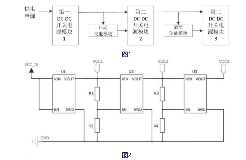 本实用新型提供了多路DC‑DC开关电源分时启动电路,包括若干依次串联的DC‑DC开关电源模块,且每个DC‑DC开关电源模块均包括一使能输入端,除第一级DC‑DC开关电源模块的使能输入端连接供电电源外,其余每个DC‑DC开关电源模块的使能输入端均连接有一可使能其开启的启动使能模块,每个启动使能模块根据前级DC‑DC开关电源模块的输出电压值设定下级DC‑DC开关电源模块的启动使能电压,控制下级DC‑DC开关电源模块的启闭。实现了分时启动开关电源的各个DC‑DC电源模块,从而降低了整个开关电源的启动电流。